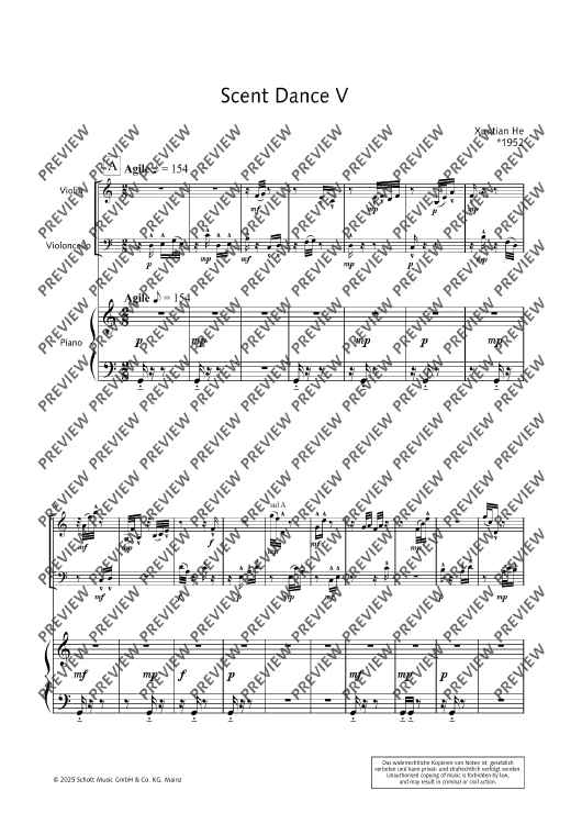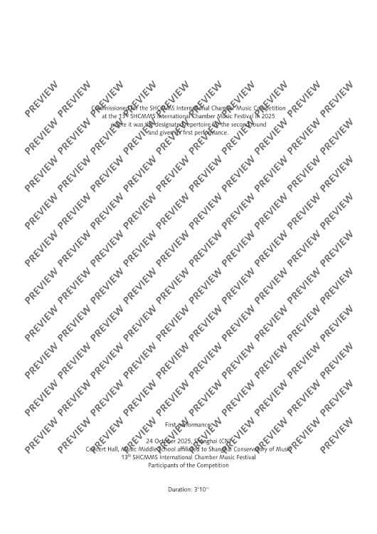 Scent Dance V joins four other works by composer Xuntian He under the same title, which he wrote for different instruments. In addition to works for clarinet solo, viola solo, violoncello solo, piano solo, and string quartet, the composer has now added a work for the classical piano trio. Composed for the SHCMMS International Chamber Music Competition, Scent Dance V demands rhythmic precision and exact ensemble playing. The music slowly builds from sporadically placed notes to an ecstatic, furious finale.