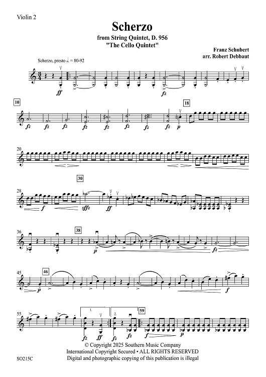 Digital Sheet Music for Scherzo from String Quintet, D. 956 - Violin 2 by Franz Schubert, Robert Debbaut scored for String Orchestra; id:507160