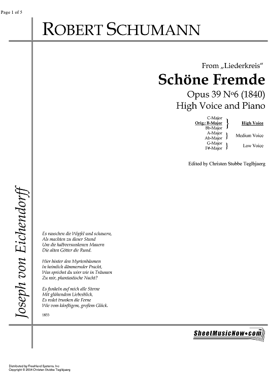 Digital Sheet Music for Schöne Fremde Op.39 No. 6 by , Robert Schumann scored for Soprano or Tenor/Piano; id:343362