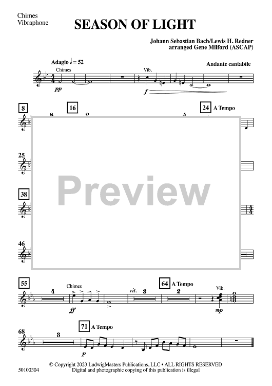 Digital Sheet Music for Season of Light - Chimes / Vibraphone by Lewis H. Redner, Johann Sebastian Bach, Gene Milford scored for Concert Band; id:509193