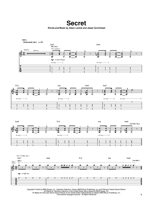 Digital Sheet Music for Secret by Adam Levine, Jesse Carmichael, Maroon 5 scored for Guitar Tab; id:373488