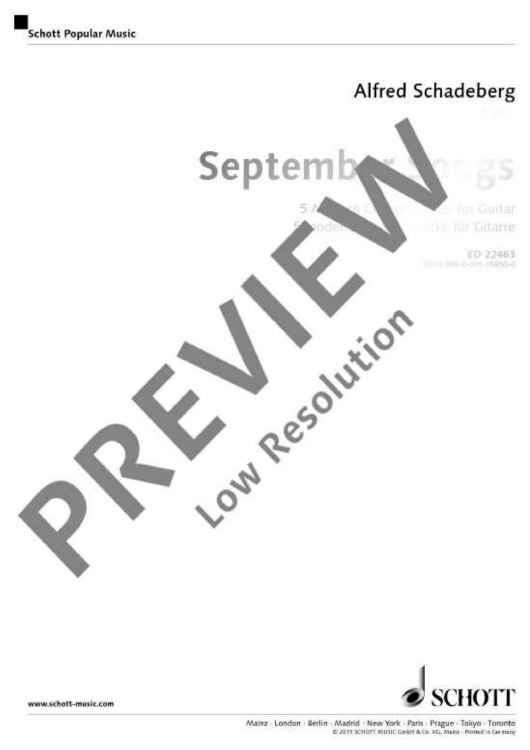 The cycle September Songs contains guitar pieces with different stylistic elements of popular music. Based on the classical style of playing, the musical spectrum includes a large number of new effects and percussive playing techniques of the modern fingerstyle guitar.