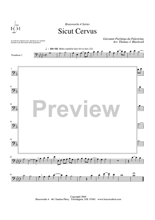 Digital Sheet Music for Sicut Cervus - Trombone 1 by Giovanni Pierluigi da Palestrina, Thomas J. Blackwell scored for Brass Quartet; id:318785