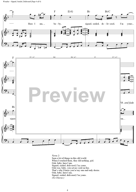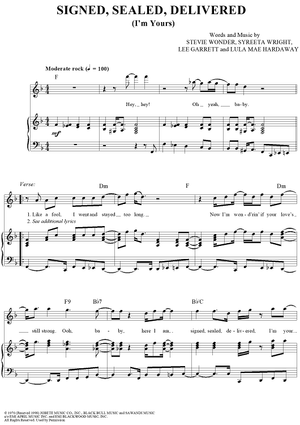 Digital Sheet Music for Signed, Sealed, Delivered (I'm Yours) by Stevie Wonder, Syreeta Wright, Lula Mae Hardaway, Lee Garrett scored for Piano/Vocal/Chords; id:119905