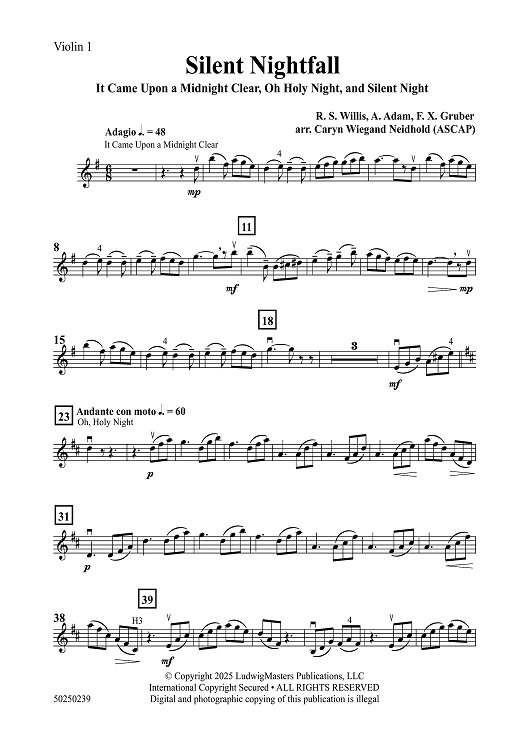Digital Sheet Music for Silent Nightfall - Violin 1 by Franz Xaver Gruber, Richard Storrs Willis, Adolphe Adam, Caryn Wiegand Neidhold scored for Orchestra; id:508393