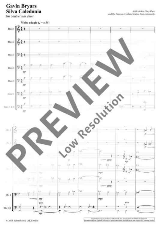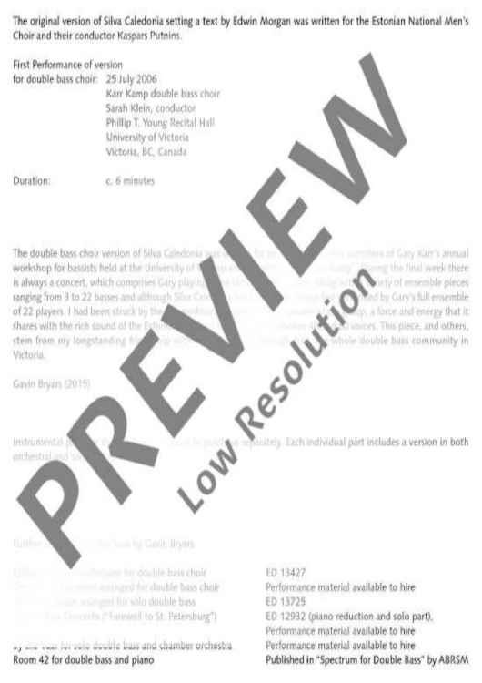This is a special arrangement for double bass choir of the choral piece Silva Caledonia, written for the Estonian National Male Choir, which sets a text by the Scottish poet Edwin Morgan. It was first performed by them in April 2006. The double bass version was written for the large group of basses, 22 for the first performance, at Basses Loaded, the annual concert from Gary Karr's summer school in Victoria BC. Gavin BryarsBoth solo and orchestral tuning are included with each individual instrumental part.