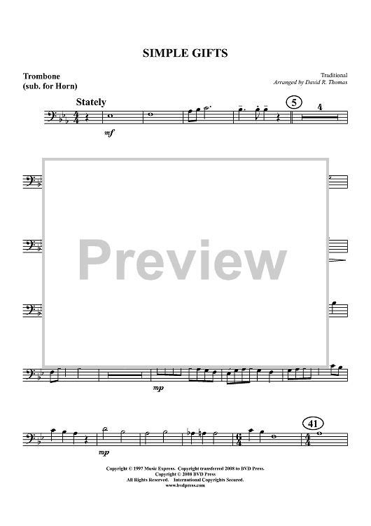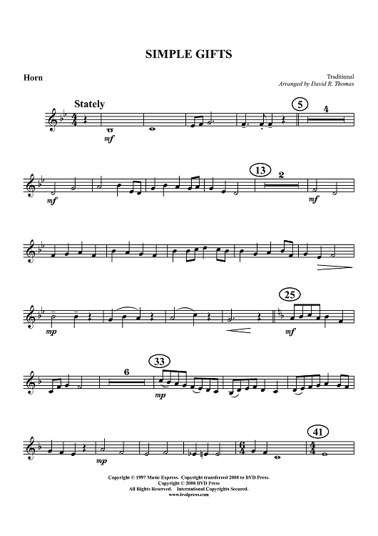 "Simple Gifts - Horn in F (plus optional part for Trombone)" Sheet Music by Traditional
