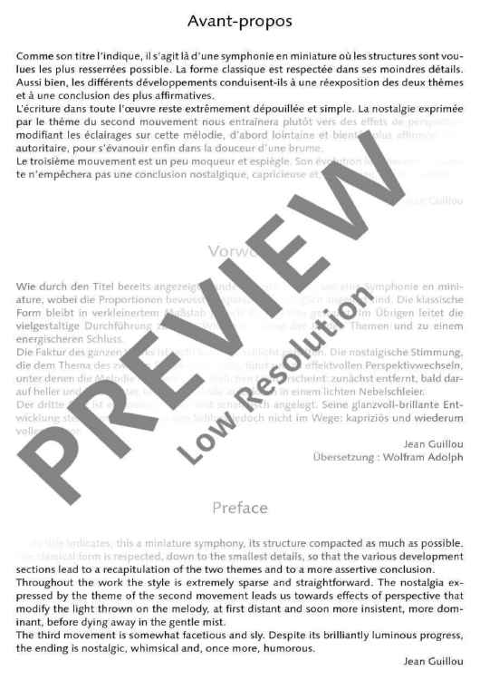 As its title indcates, this is a miniature symphony, its structure compacted as much as possible. The classical form is respected, dwon to the smallest details, so that the various development sections lead to a recapitulation of the two themes and to a more asservative conclusion. Throughout the work the style is extremely sparse and straightforward. The nostalgia expressed by the theme of the second movement leads us towards effects of perspective that modify the light thrown on the melody, at first distand and soon more insistent, more dominant, before dying away in the gentle mist. The third movement is somewhat facetious and sly. Despite its brilliantly luminous progress, the ending is nostalgic, whimsical and, once more, humorous.