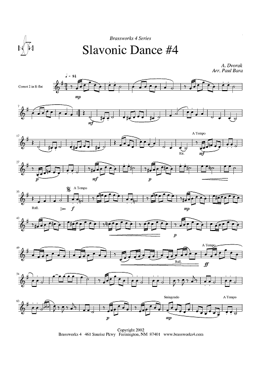 Digital Sheet Music for Slavonic Dance No. 4 - Cornet 2 in Bb by Antonín Dvorák, Paul Bara scored for Brass Quartet; id:428520