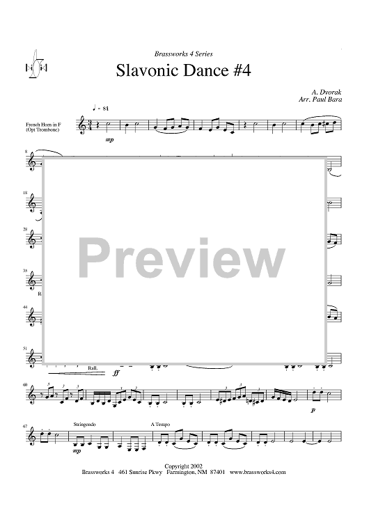 Digital Sheet Music for Slavonic Dance No. 4 - Trombone (opt. F Horn) by Antonín Dvorák, Paul Bara scored for Brass Quartet; id:428521