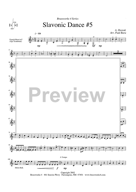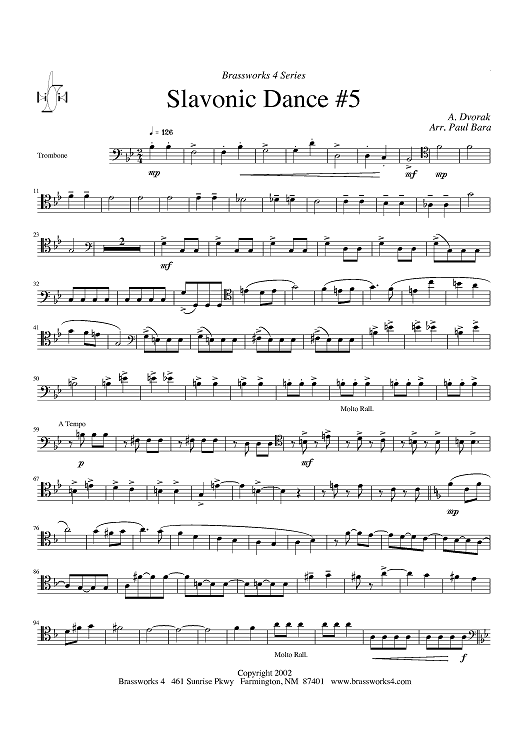 Digital Sheet Music for Slavonic Dance No. 5 - Trombone (opt. F Horn) by Antonín Dvorák, Paul Bara scored for Brass Quartet; id:428527