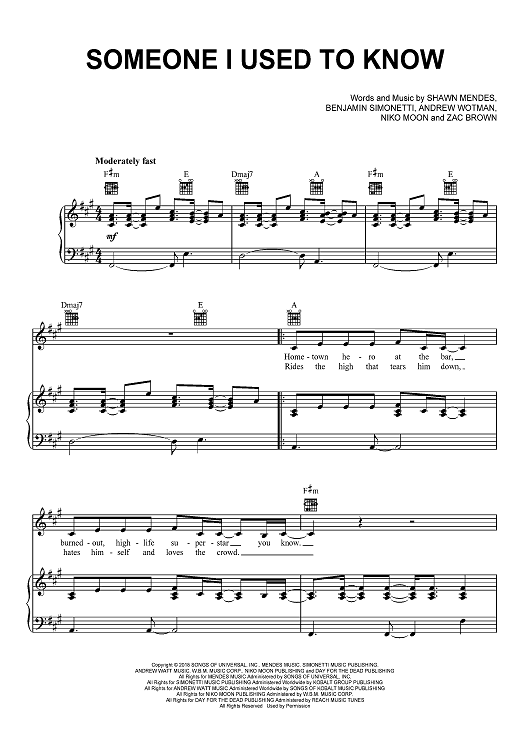 Digital Sheet Music for Someone I Used To Know by Zac Brown, Shawn Mendes, Andrew Wotman, Benjamin Simonetti, Niko Moon scored for Piano/Vocal/Chords; id:466870