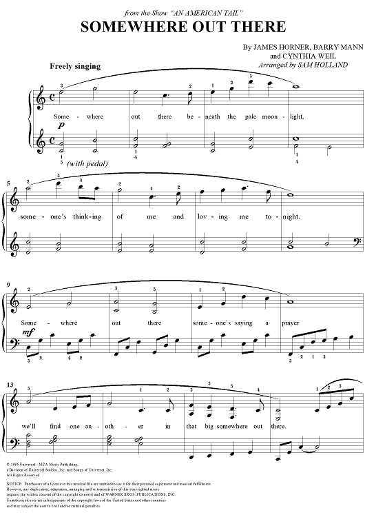 Digital Sheet Music for Somewhere Out There by Barry Mann, Sam Holland, Cynthia Weil, James Horner scored for Easy Piano/Vocal; id:287405