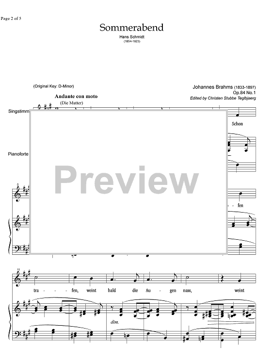 Digital Sheet Music for Sommerabend Op.84 No. 1 by , Johannes Brahms scored for Soprano or Tenor/Piano; id:336951