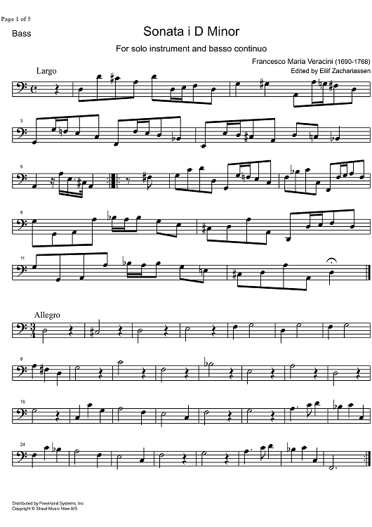 Digital Sheet Music for Sonata d minor - Continuo by Francesco Maria Veracini, Eilif Zachariassen scored for 1 Instrument/Continuo; id:327729