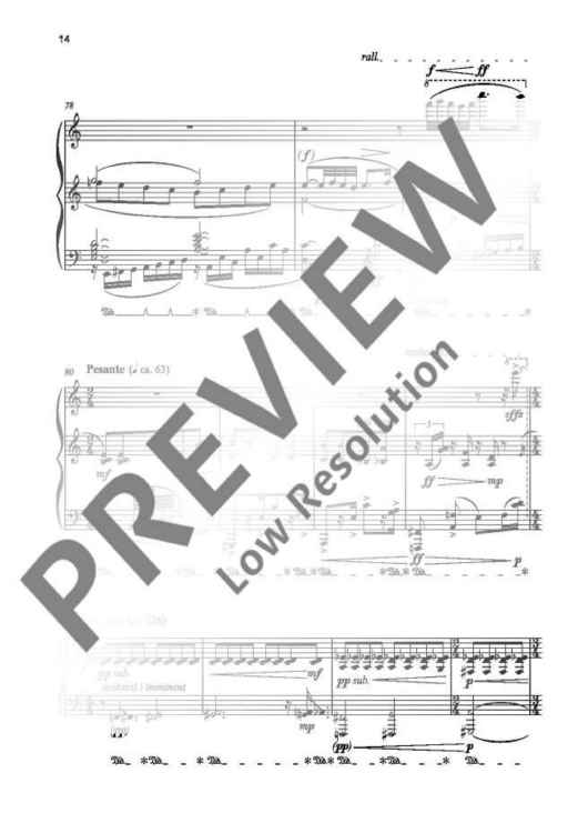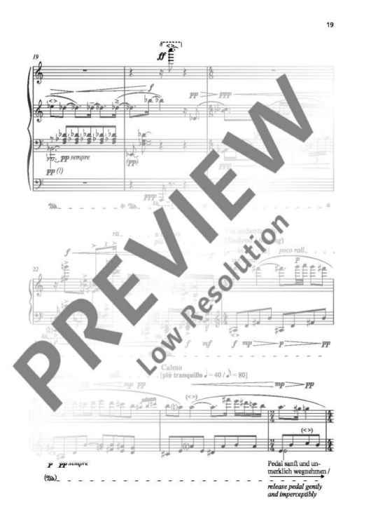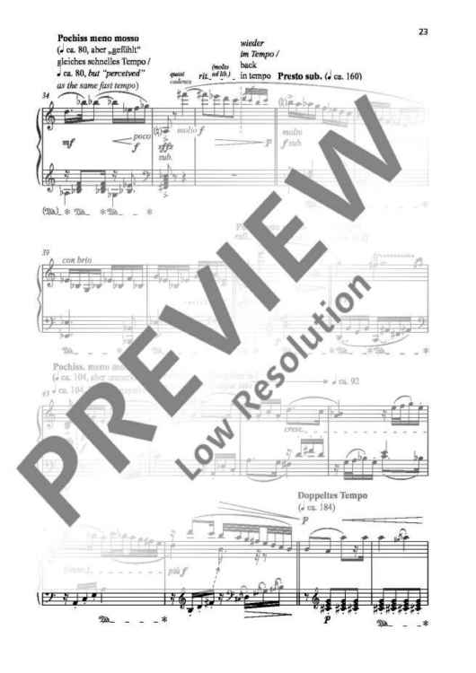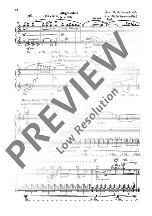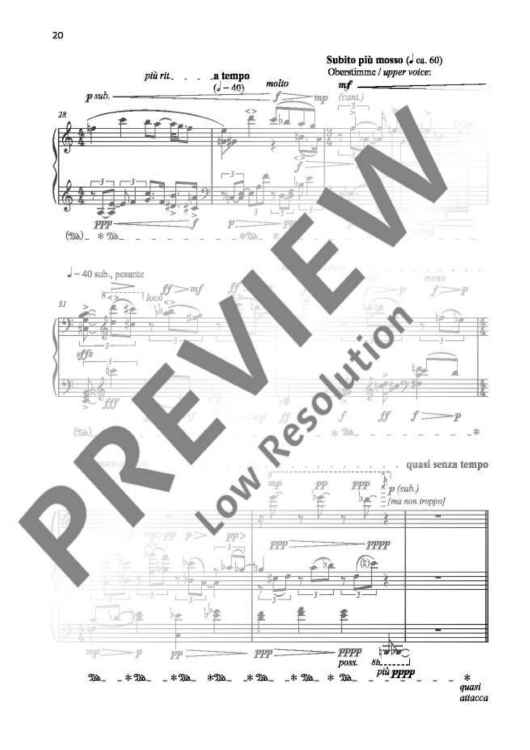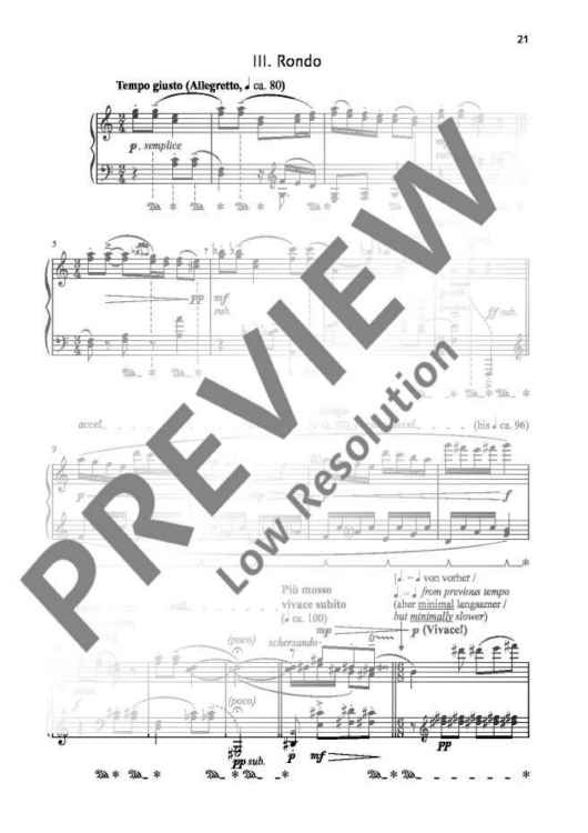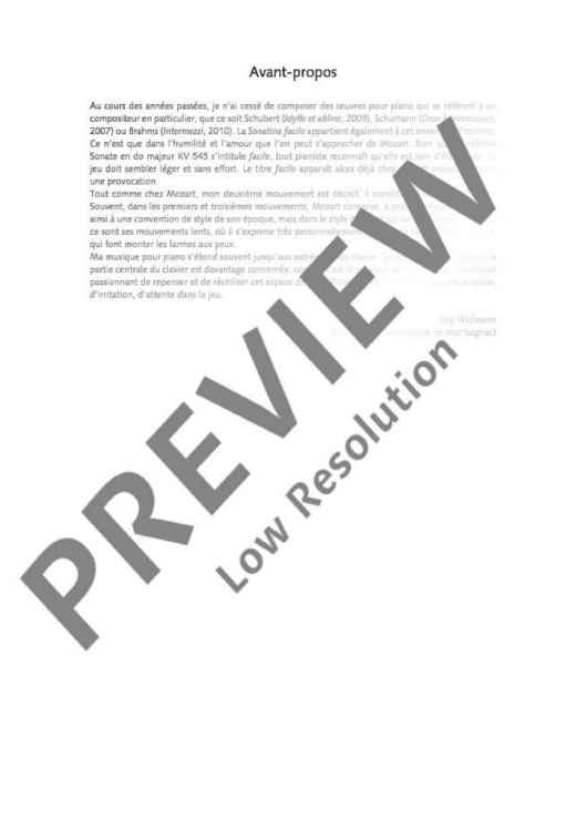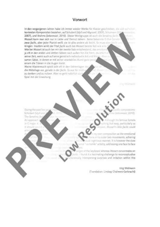 As implied by the title Sonatina facile, this piano piece is an homage to Mozart’s famous Sonata in C major K. 545. Not only are the movement headings Allegro - Andante - Rondo identical, but Jörg Widmann also explores Mozart’s stylistic qualities, while playing with the ideals of Neoclassicism. In the outer movements, the themes from K. 545 appear repeatedly alongside typical figures from the Mozart’s time such as the famous Alberti bass in the accompaniment. From time to time, the piece distances itself far from the concept of simplicity: the complexity of the piano texture and wild expressive, tempo and dynamic changes sporadically lead the “facile” ad absurbum.