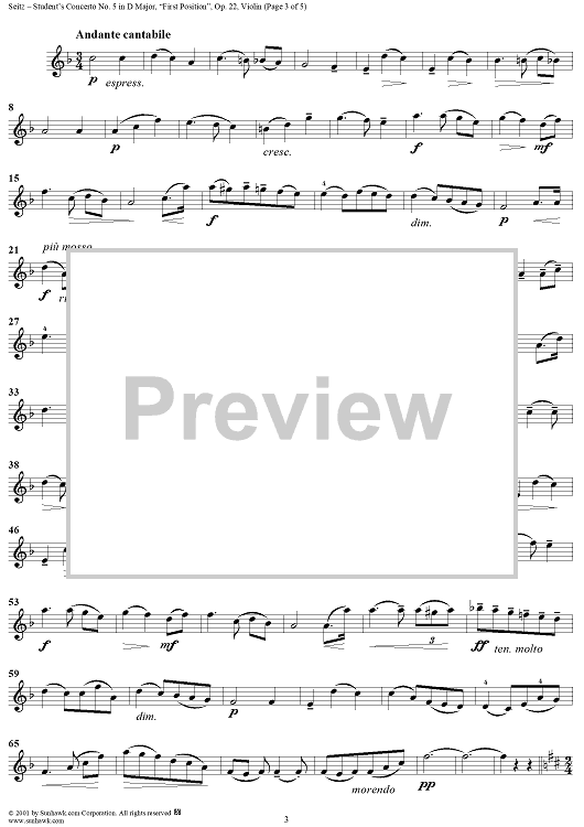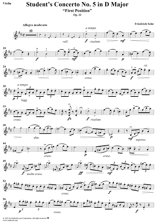 "Student's Concerto No. 5 in D Major, "First Position", Op. 22, No. 5 - Violin" Sheet Music by Friedrich Seitz