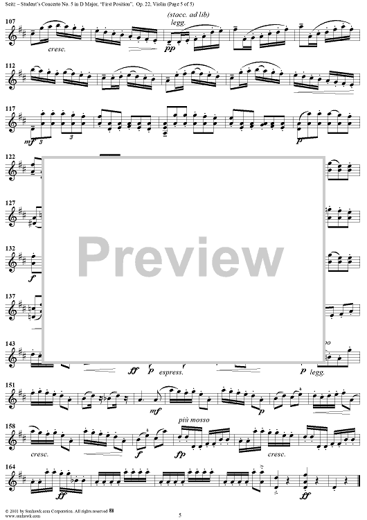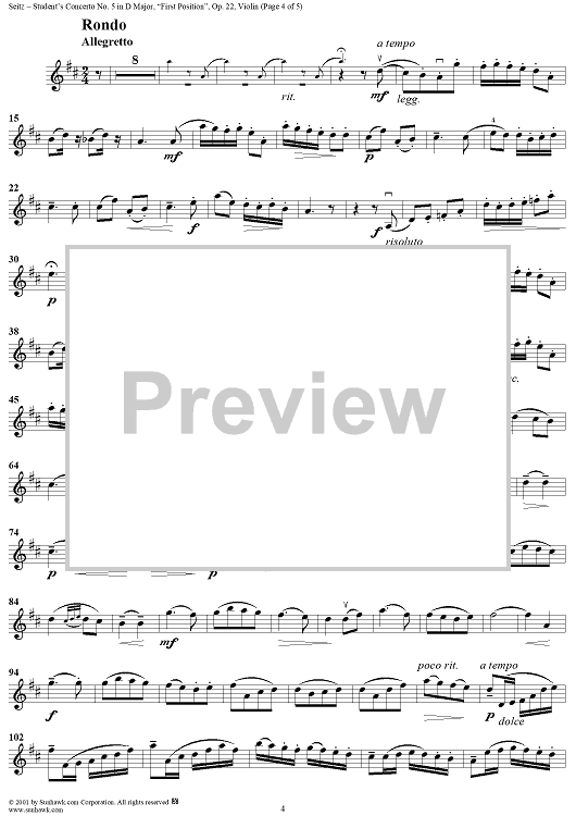 Digital Sheet Music for Student's Concerto No. 5 in D Major, "First Position", Op. 22, No. 5 - Violin by Friedrich Seitz scored for Violin/Piano; id:257546