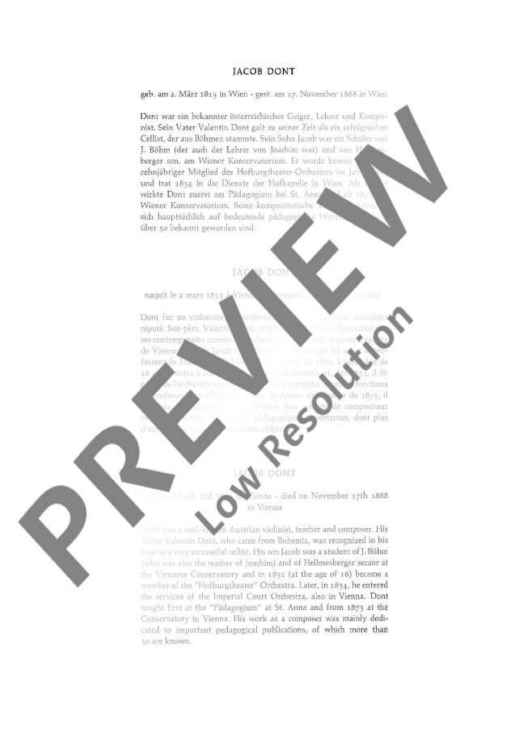 'The Austrian violinist Jacob Dont (1815-1888) was also a highly esteemed teacher and composer. He wrote mainly major educational works, over 50 of which have become quite well-known. Dont's 'Etüden und Capricen' Op. 35 were arranged for the viola by Max Rostal who also added preparatory exercises and variants. 'Etüden und Capricen' covers all technical demands with regard to arpeggios, double stops, dexterity, change of position, legato, change of string, types of bowing, trills and appoggiaturas, thus laying the foundation for practising any repertoire.