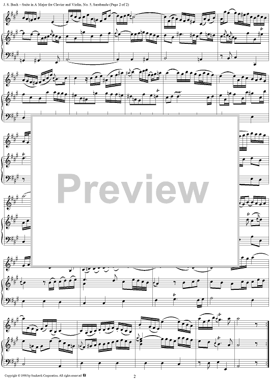 Digital Sheet Music for Suite in A major for Violin and Keyboard, no. 5: Sarabande by Johann Sebastian Bach scored for Violin/Piano; id:95505