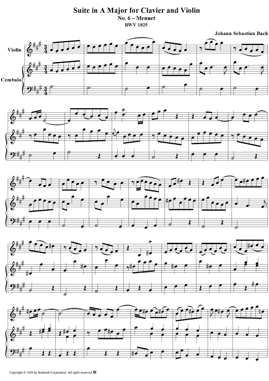Digital Sheet Music for Suite in A major for Violin and Keyboard, no. 6: Menuet by Johann Sebastian Bach scored for Violin/Piano; id:95506