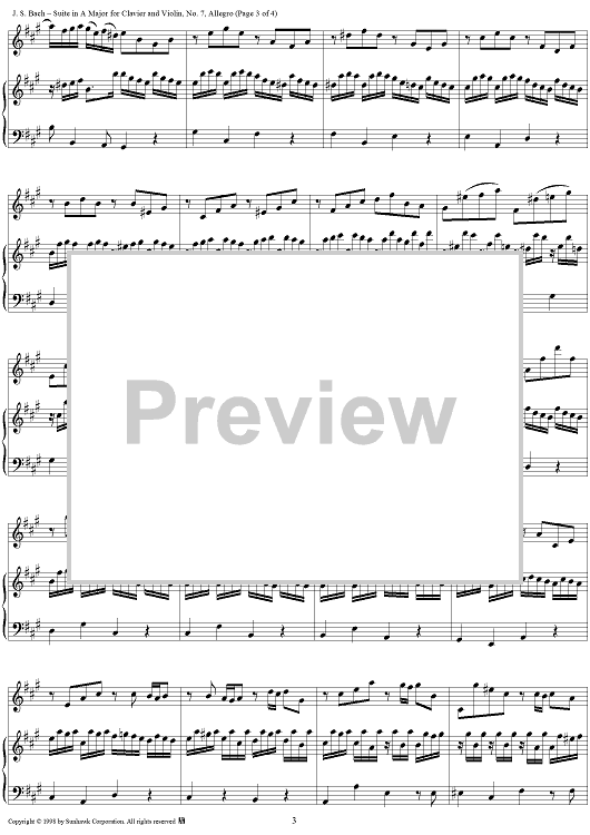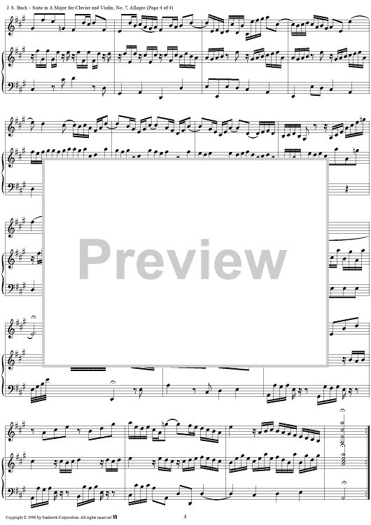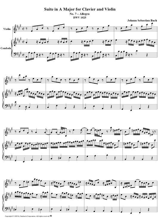 Digital Sheet Music for Suite in A major for Violin and Keyboard, no. 7: Allegro by Johann Sebastian Bach scored for Violin/Piano; id:95507