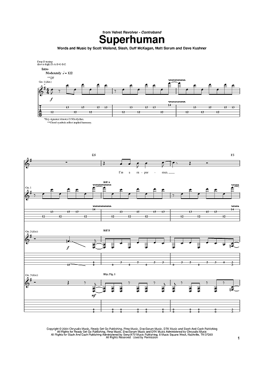 Digital Sheet Music for Superhuman by Scott Weiland, Slash, Dave Kushner, Duff McKagan, Matt Sorum, Velvet Revolver scored for Guitar Tab; id:383511