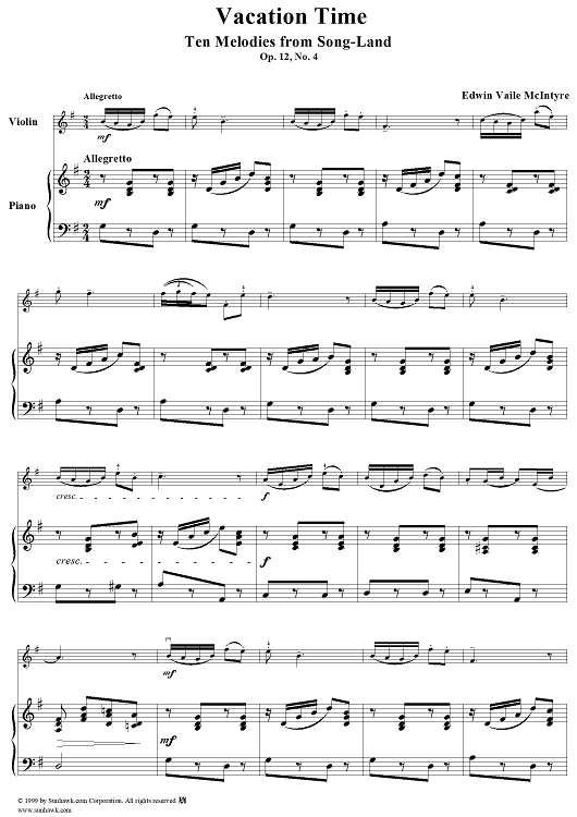 Digital Sheet Music for Ten Melodies from Song-Land, Op12 - 4. Vacation Time by Edwin Vaile McIntyre scored for Violin/Piano; id:251705