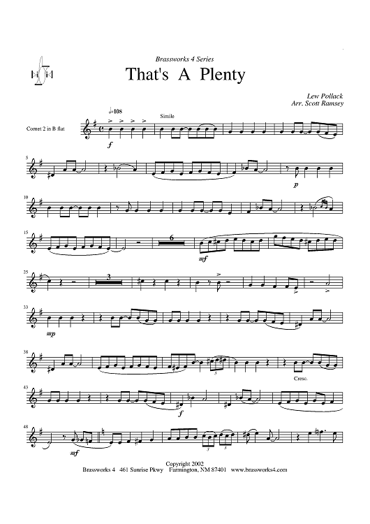 Digital Sheet Music for That's A Plenty - Cornet 2/Trumpet 2 by Lew Pollack, Scott A. Ramsey scored for Brass Quartet; id:316703