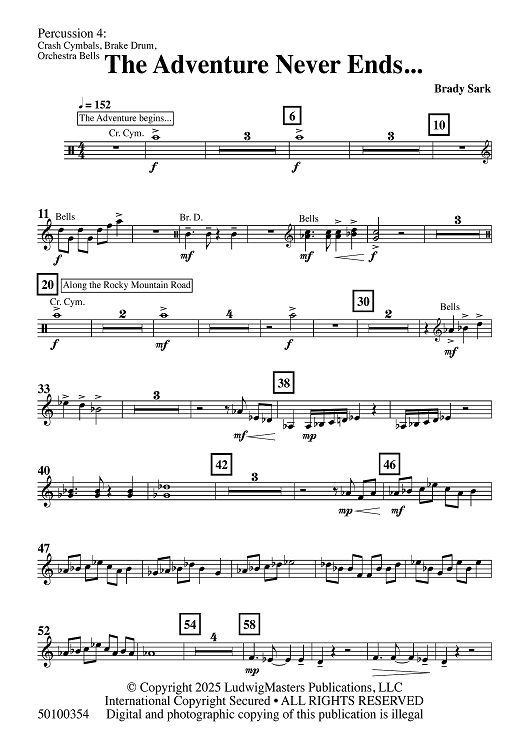 Digital Sheet Music for The Adventure Never Ends - Percussion 4 by Brady Sark scored for Concert Band; id:506991