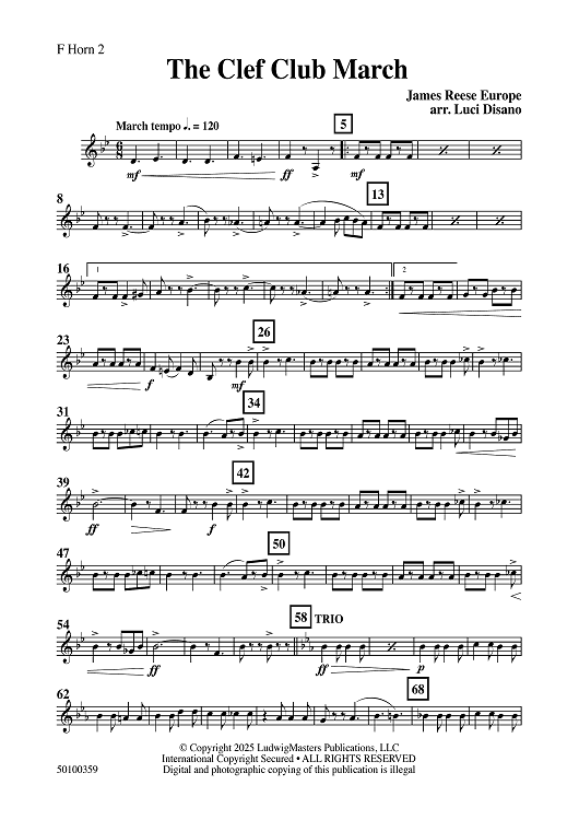 Digital Sheet Music for The Clef Club March - F Horn 2 by James Reese Europe, Luci Disano scored for Concert Band; id:507089