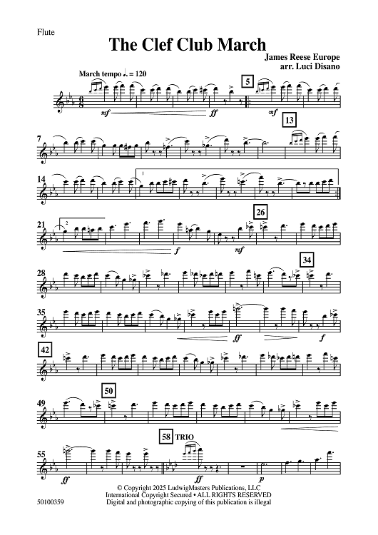 Digital Sheet Music for The Clef Club March - Flute by James Reese Europe, Luci Disano scored for Concert Band; id:507068