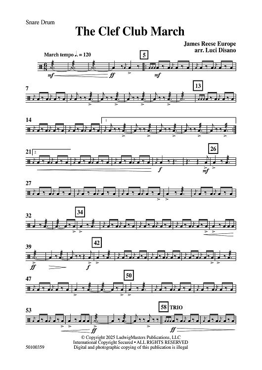 Digital Sheet Music for The Clef Club March - Snare Drum by James Reese Europe, Luci Disano scored for Concert Band; id:507097