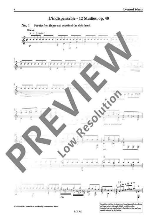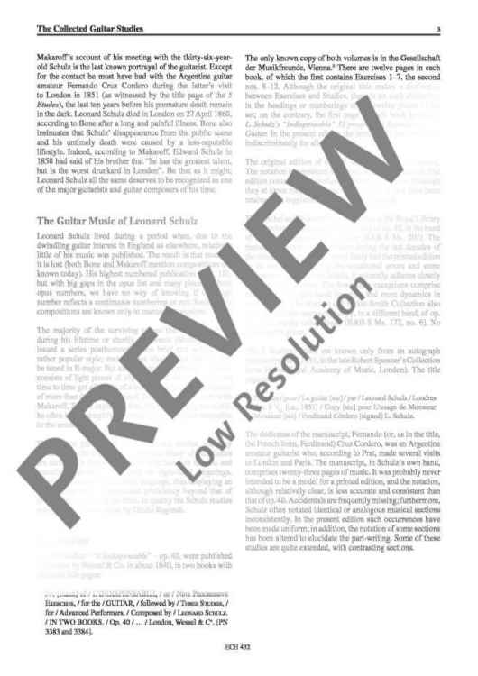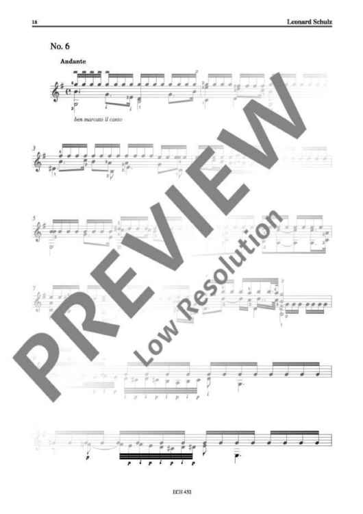This edition presents all Schulz’s known studies, and they demonstrate the composer at his best. Many of the studies are technically demanding, often with focus on specific and sometimes unusual techniques or right-hand fingerings. They also have a rich harmonic language, thus displaying an instrumental and compositional proficiency beyond that of the average guitarist at the time. In quality the Schulz studies may be compared to those by Giulio Regondi.