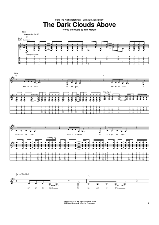 Digital Sheet Music for The Dark Clouds Above by Tom Morello, The Nightwatchman scored for Guitar Tab; id:401126