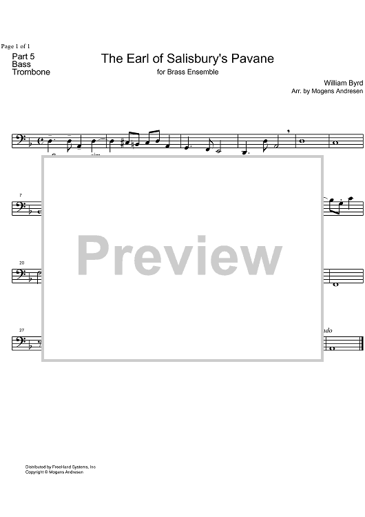 Digital Sheet Music for The Earl of Salisbury's Pavane - Bass Trombone by William Byrd, Mogens Andresen scored for Brass Ensemble; id:328233
