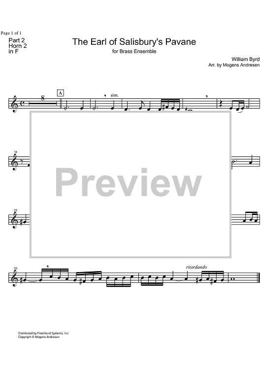 Digital Sheet Music for The Earl of Salisbury's Pavane - Horn in F 2 by William Byrd, Mogens Andresen scored for Brass Ensemble; id:328230