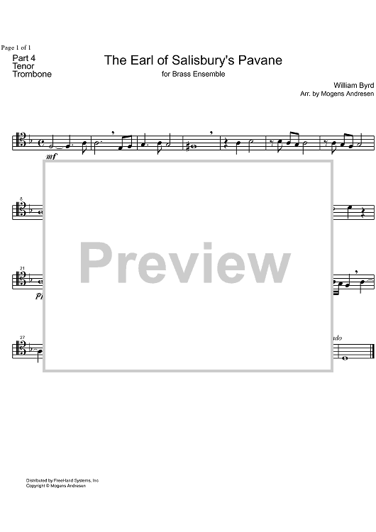 Digital Sheet Music for The Earl of Salisbury's Pavane - Tenor Trombone by William Byrd, Mogens Andresen scored for Brass Ensemble; id:328232