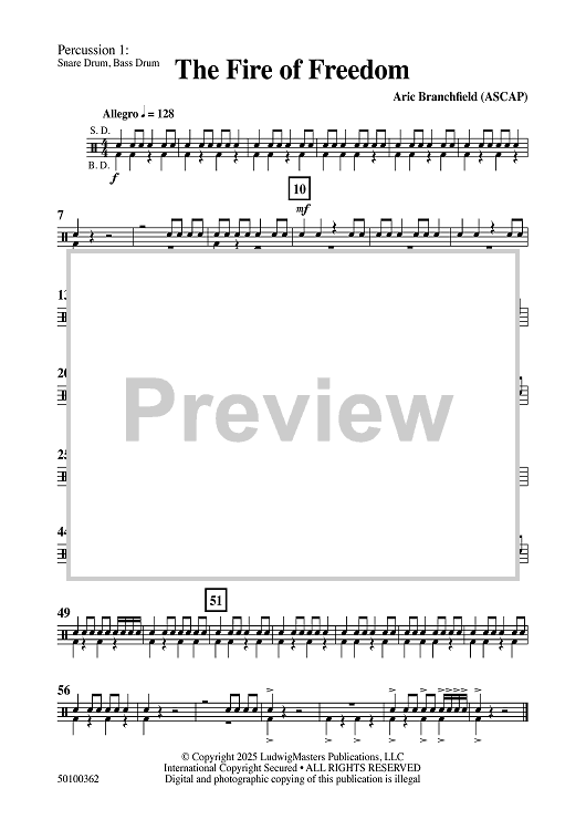 Digital Sheet Music for The Fire of Freedom - Percussion 1 by Aric Branchfield scored for Concert Band; id:509320