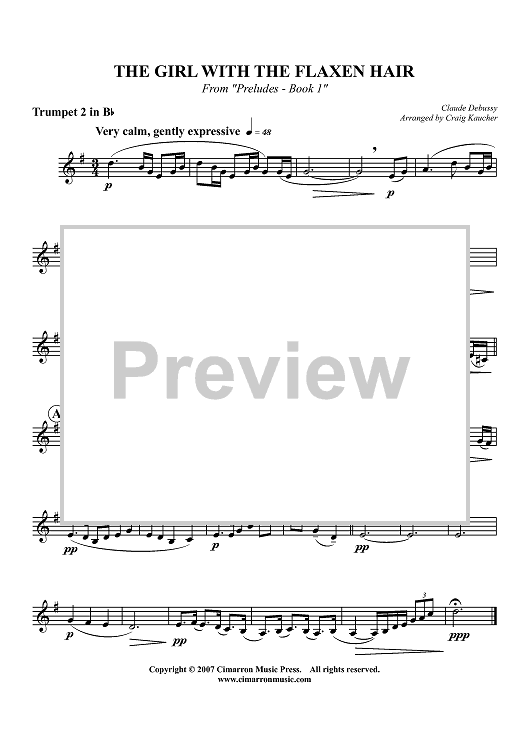 Digital Sheet Music for The Girl with the Flaxen Hair - From "Preludes - Book 1" - Trumpet 2 in Bb by Claude Debussy, Craig Kaucher scored for Brass Quartet; id:413917