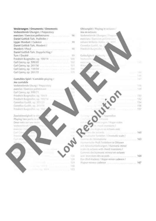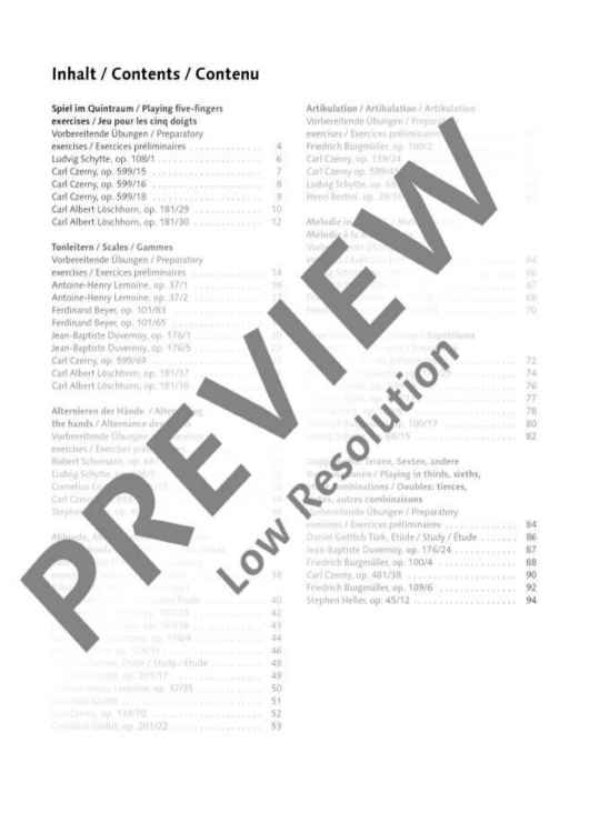 Practising studies? 'Yes, of course', some say. 'No, rather not,' others say. The educational benefit of studies for the training as a pianist, however, is undisputed among experts if the study is not played mechanically but used specifically to learn to master certain technical and musical problems. The present 'great book of studies' contains everything that is needed for the technical training on the elementary and intermediate levels of piano lessons – including beautiful studies by Bertini, Burgmüller, Czerny, Duvernoy, Gurlitt, Heller, Lemoine, Schumann, Türk, and many others. The great book of studies is divided in 14 chapters, each of which dealing specifically with different technical issues. In so-called 'preparatory exercises', the player can work on the respective technical problems in a concentrated and problem-oriented manner. The subsequent studies have been chosen such that they are both technically useful and musically appealing.