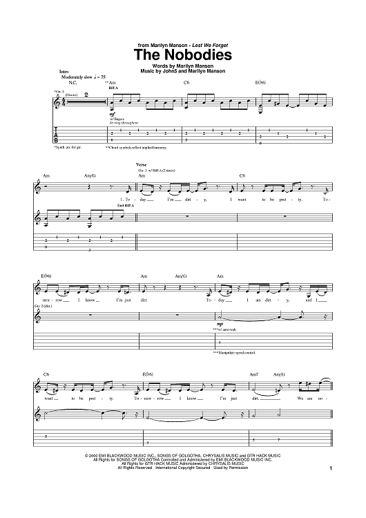 Digital Sheet Music for The Nobodies by John 5, Marilyn Manson scored for Guitar Tab; id:384637