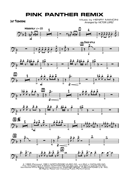 Digital Sheet Music for The Pink Panther Remix - Trombone 1 by Henry Mancini, Victor Lopez scored for Jazz Ensemble; id:358896