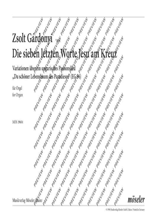 In diesen kurzen und eindrucksvollen Variationen über den ungarischen Passions-Choral "Du schöner Lebensbaum des Paradieses" (EG 96) finden Sie die ideale Musik für Konzerte oder Passionsandachten, insbesondere zur Todesstunde am Karfreitag. Die Stücke sind je mit einem der sieben letzten Gedanken Jesu am Kreuz überschrieben, die im Sinne eines ganzheitlichen Verständnisses bei konzertanten Aufführungen rezitiert werden können.