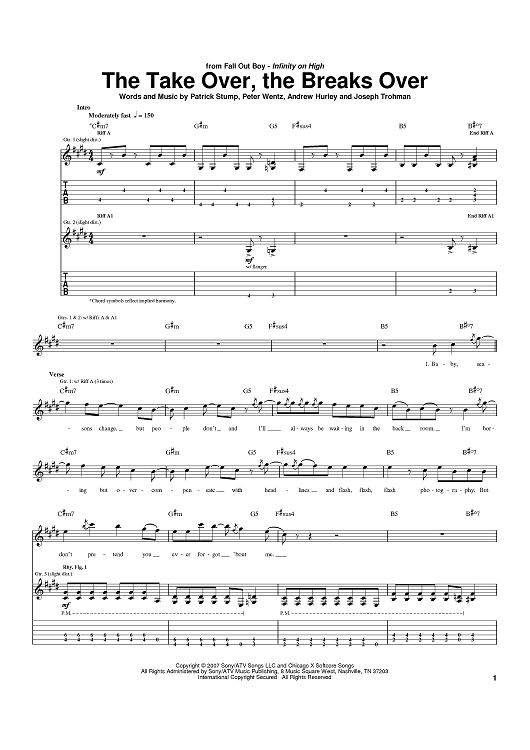 Digital Sheet Music for The Take Over, The Breaks Over by Patrick Stump, Peter Wentz, Andrew John Hurley, Joseph Trohman, Fall Out Boy scored for Guitar Tab; id:401459