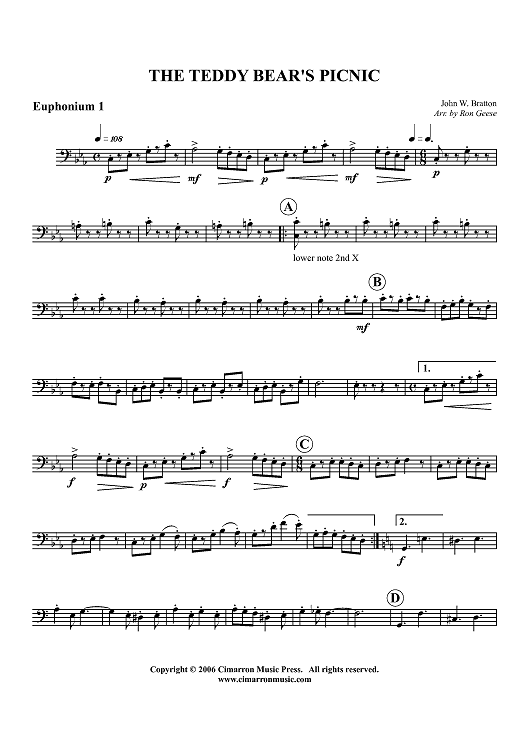 Digital Sheet Music for The Teddy Bear's Picnic - Euphonium 1 BC/TC by John W. Bratton, Ron Geese scored for Tuba Quartet; id:360268