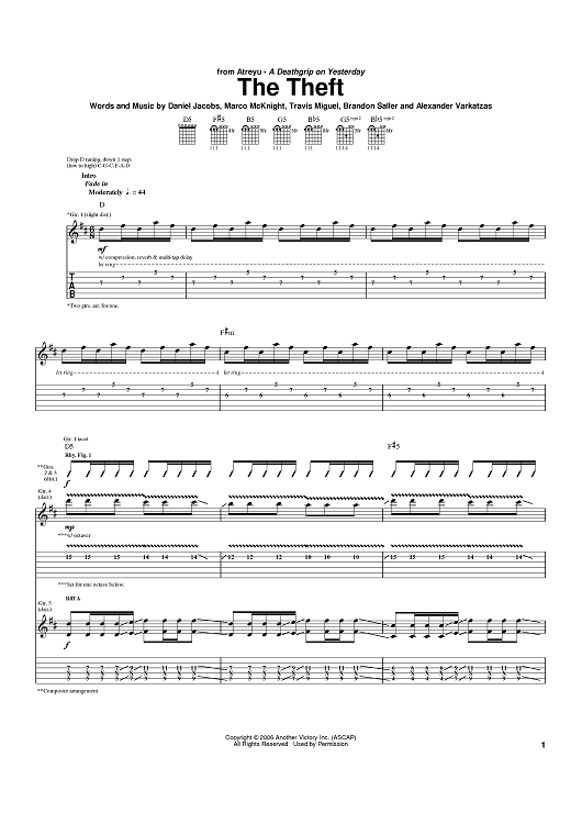 Digital Sheet Music for The Theft by Atreyu, Daniel Jacobs, Marco McKnight, Travis Miguel, Brandon Saller, Alexander Varkatzas scored for Guitar Tab; id:394557