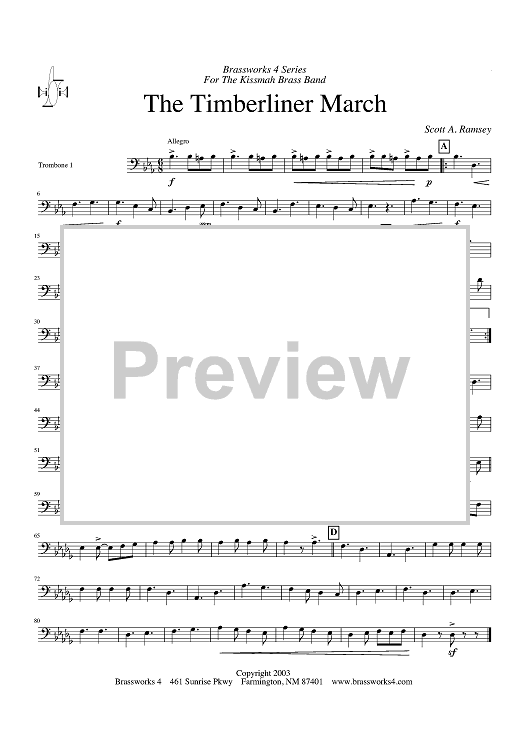 Digital Sheet Music for The Timberliner March - Trombone 1 by Scott A. Ramsey scored for Brass Ensemble; id:428195