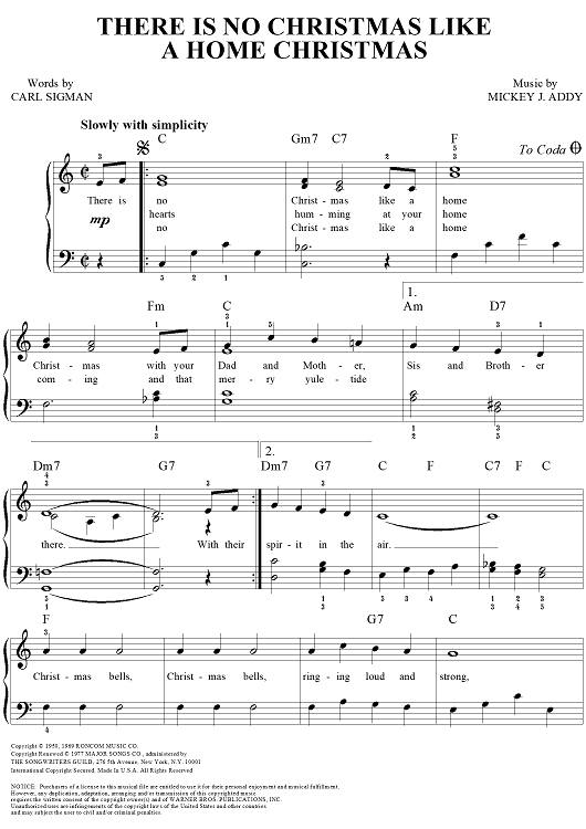 Digital Sheet Music for There's No Christmas Like a Home Christmas by Carl Sigman, Mickey J. Addy scored for Easy Piano/Vocal; id:277968