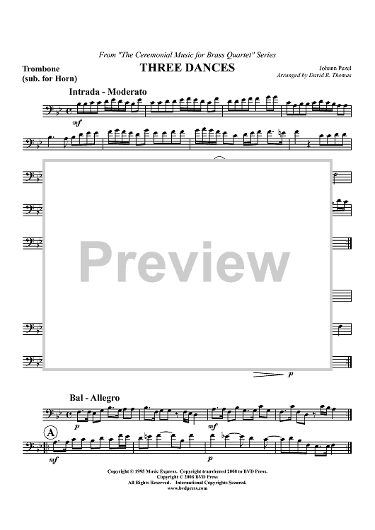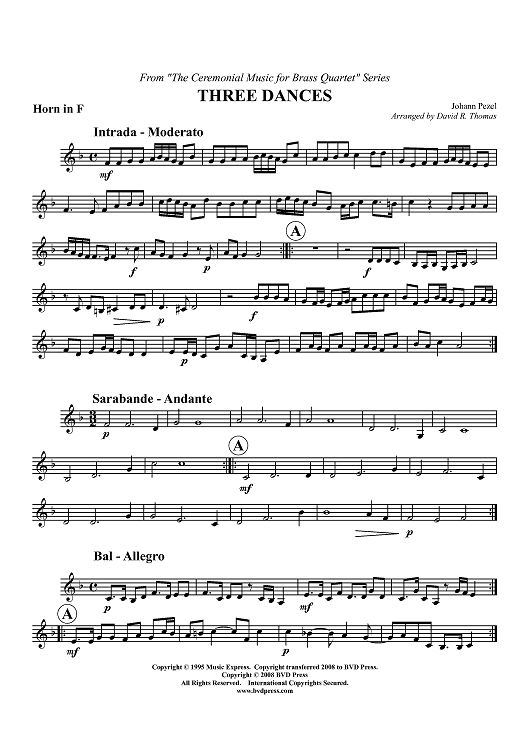 Digital Sheet Music for Three Dances - Horn in F (plus optional part for Trombone) by Johann Pezel, David R. Thomas scored for Brass Quartet; id:404645